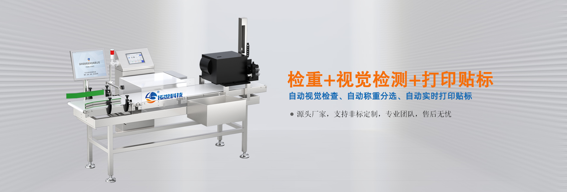 公司的核心技術團隊是由多名自動化行業研發精英組成,采用自主研發的自動化系統,自動實現檢重,金檢,噴碼打標,打印貼標,視覺檢測全過程自動化控制。為客戶提供完整的服務解決方案,堅持不斷創新。